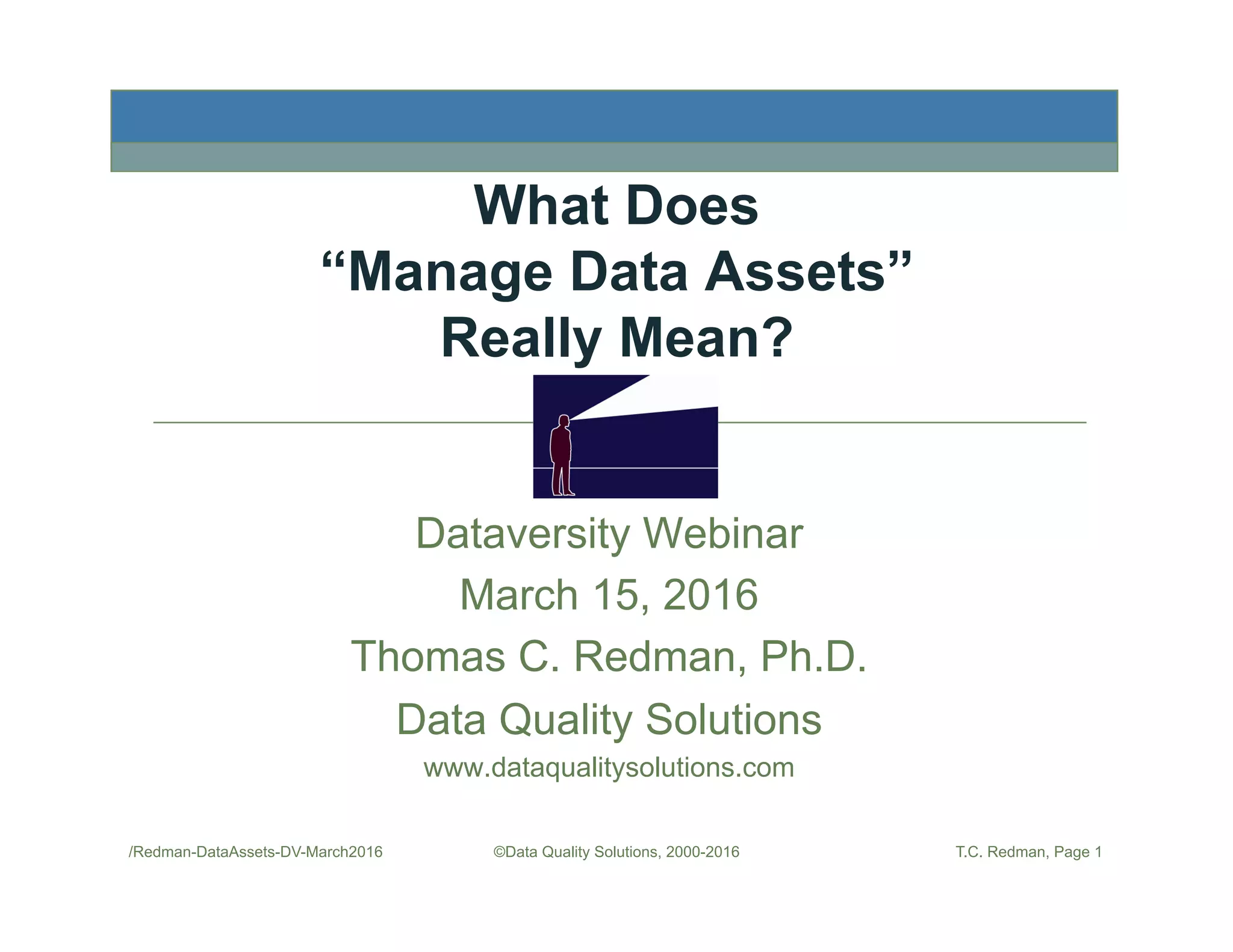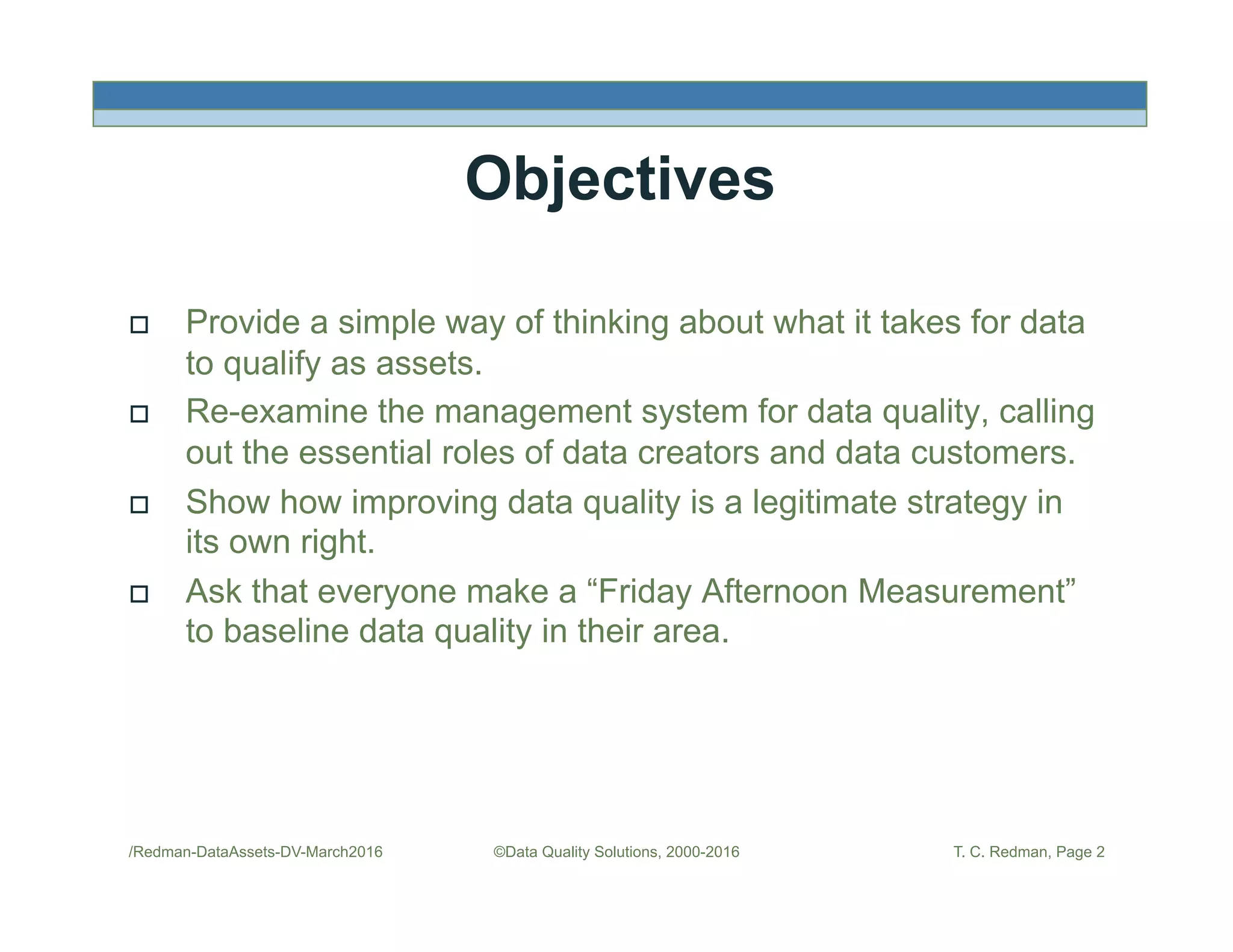 The document discusses managing data as assets and improving data quality. It defines what it means to manage data as assets by taking care of data, putting data to work, and advancing the management system. It emphasizes the roles of data creators and customers and how improving data quality can reduce costs. It recommends organizations perform a "Friday Afternoon Measurement" to assess data quality by reviewing recent records and identifying errors.