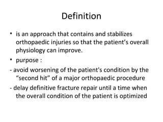 Damage control orthopaedics is an approach that temporarily stabilizes orthopaedic injuries to avoid worsening a patient's condition through definitive surgery. It aims to delay repair until the patient's physiology improves. Key indications include unstable pelvic fractures, femoral fractures in patients with chest injuries, and mangled or isolated lower extremity trauma. Temporary external fixation is often used followed by staged definitive surgery once the patient stabilizes in 2-8 days. Monitoring inflammatory markers like IL-6 helps determine when secondary procedures can be safely performed.