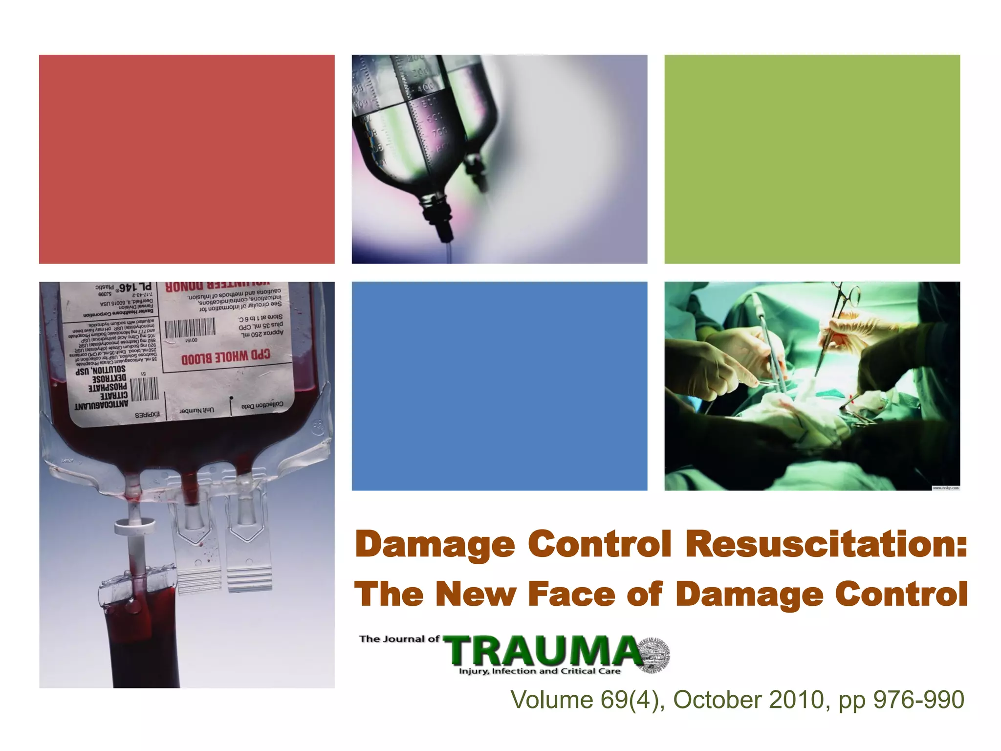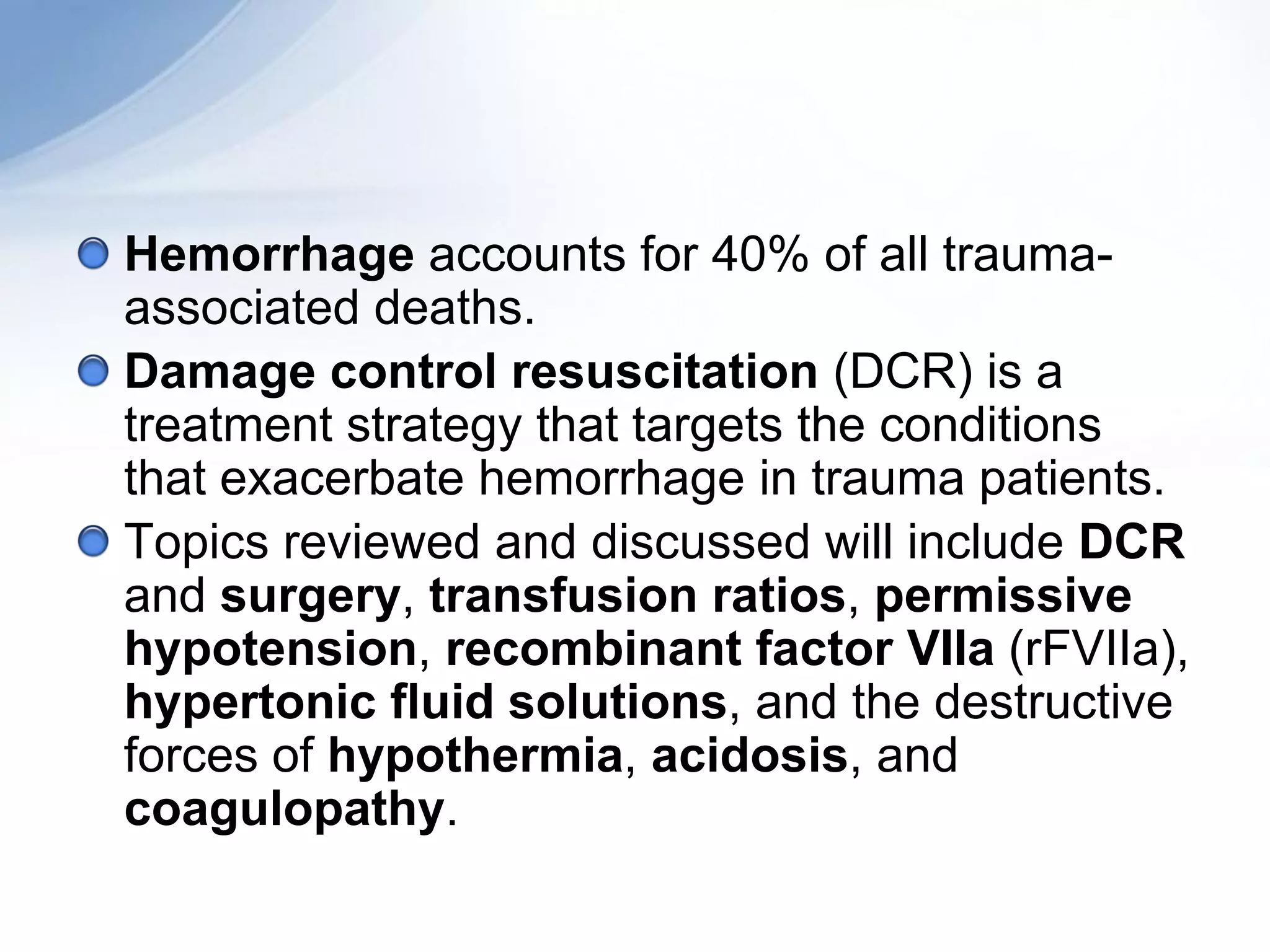 Damage control resuscitation (DCR) is a strategy aimed at addressing hemorrhage and its exacerbating factors in trauma patients, focusing on aggressive correction of coagulopathy, hypothermia, and acidosis. It involves key concepts like permissive hypotension, the use of blood products for volume replacement, and a specific protocol for surgical interventions. DCR emphasizes early intervention both in the emergency room and during later surgical procedures to improve survival outcomes for severely injured patients.