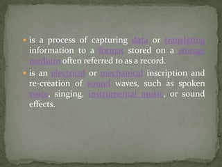 Recordings can be analog or digital. Analog recording captures sound waves on a medium like a phonograph. Digital recording converts sound to a series of numbers and stores it digitally. Recordings are used in education for speech practice, drama, and music. They allow replaying lessons and come in formats like tapes, records, and CDs. The recording process involves capturing sound, converting it to numeric format, storing it, and reconverting playback. Recordings provide a safe, easy way to store information but overuse can bore students.