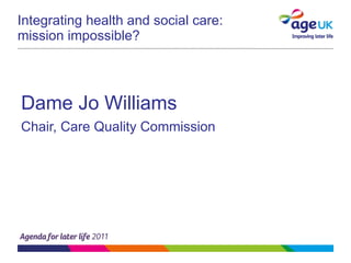 The document discusses integrating health and social care services in the UK. It notes that while integration is challenging, it is possible if organizations have a shared vision and strong local leadership. The Care Quality Commission can help with integration by overseeing quality, seeking people's experiences, and ensuring cooperation between providers especially around care planning, information sharing, and emergency procedures. The CQC will focus on eliminating poor quality care, centering on people's needs, and ensuring their rights are protected through engagement with stakeholders.