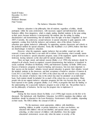 This document discusses the debate around inclusive education. It defines inclusive education as educating all students, regardless of ability, together in the same environment with necessary supports. The document outlines legal, moral, and empirical reasons why inclusion should be adopted, noting that the Individuals with Disabilities Education Act requires educating students in the least restrictive environment. However, it also acknowledges that full inclusion may not be appropriate for every student and that individual needs must be assessed to determine the appropriate level of inclusion. It provides an example of one student, Student K, who would likely benefit more from a separate classroom due to behaviors that could disrupt other students.