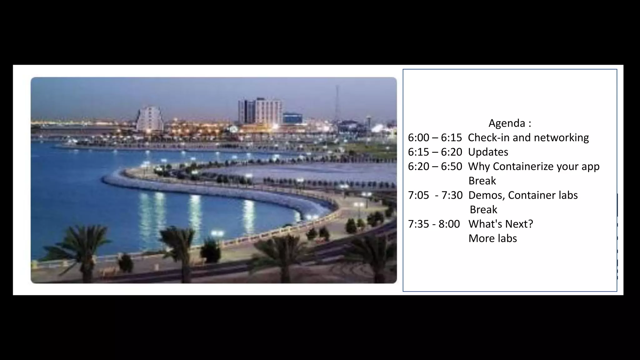 This document provides an agenda and materials for a presentation on containerizing applications. The agenda includes check-in and updates, a presentation on why to containerize apps, demos and container labs, and a discussion of next steps. The presentation materials explain what containers are, their advantages over virtual machines like improved resource utilization and portability. Open source tools for containers like Docker and Kubernetes are also discussed. There are demos of building Docker images and running containers, as well as how orchestration tools can automate deployment and management of containerized apps.