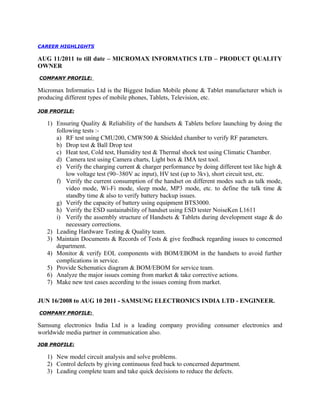 Damodaran S.V. is seeking a position that allows him to utilize his 10 years of experience in testing and analysis. He currently works as an Assistant Manager of Testing at Micromax Informatics Ltd, where he performs various tests on electronics including RF testing, camera testing, reliability testing, and more. Previously he worked at Samsung Electronics India Ltd and Bright Point India Pvt. Ltd as an Engineer performing tasks like circuit analysis, defect control, and equipment troubleshooting.