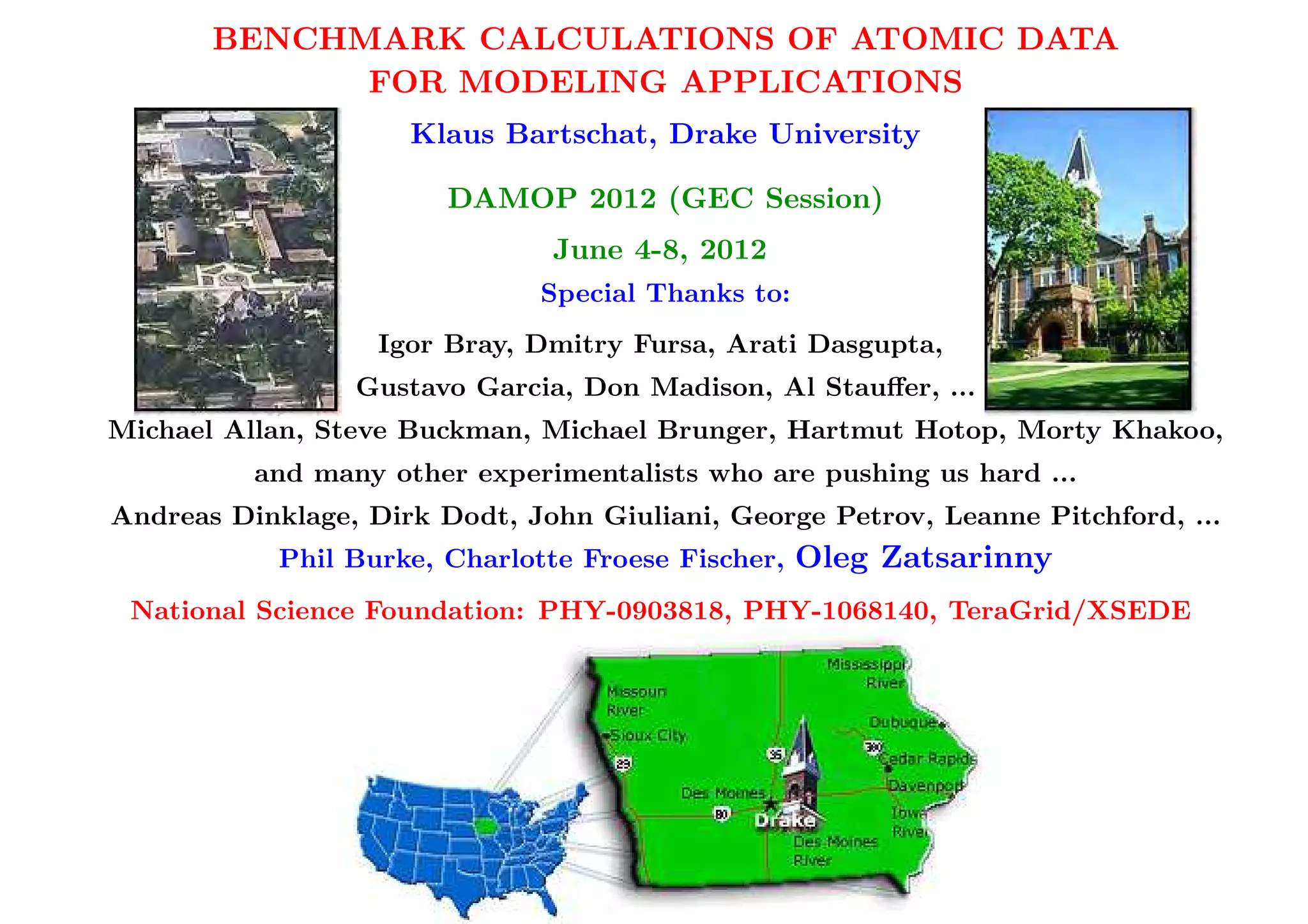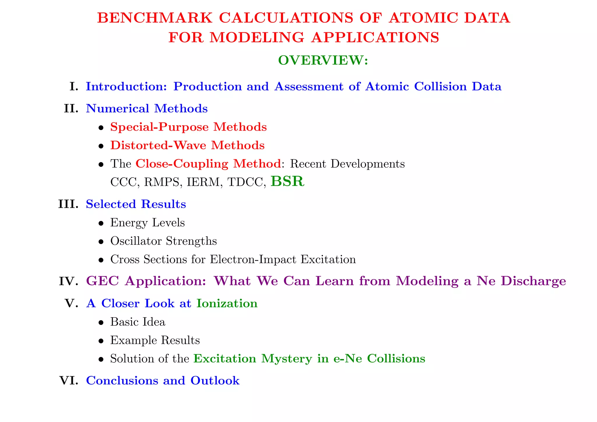This document summarizes benchmark calculations of atomic data for modeling applications. It discusses numerical methods like close-coupling and distorted-wave approaches for calculating atomic collision data. It provides selected results on energy levels, oscillator strengths, and electron-impact excitation cross sections. It also discusses applications to modeling neon discharges and takes a closer look at ionization calculations and examples. The document concludes by discussing the production and assessment of atomic data and outlines challenges in obtaining reliable data from both experiments and calculations.