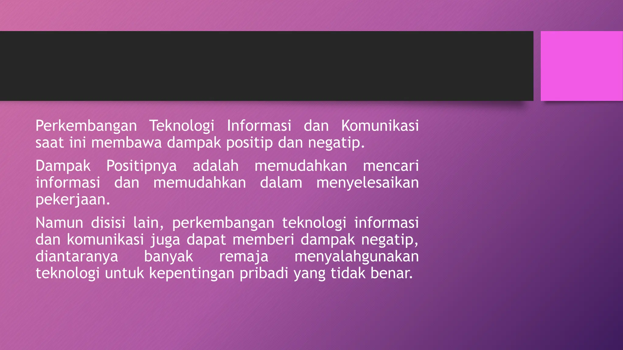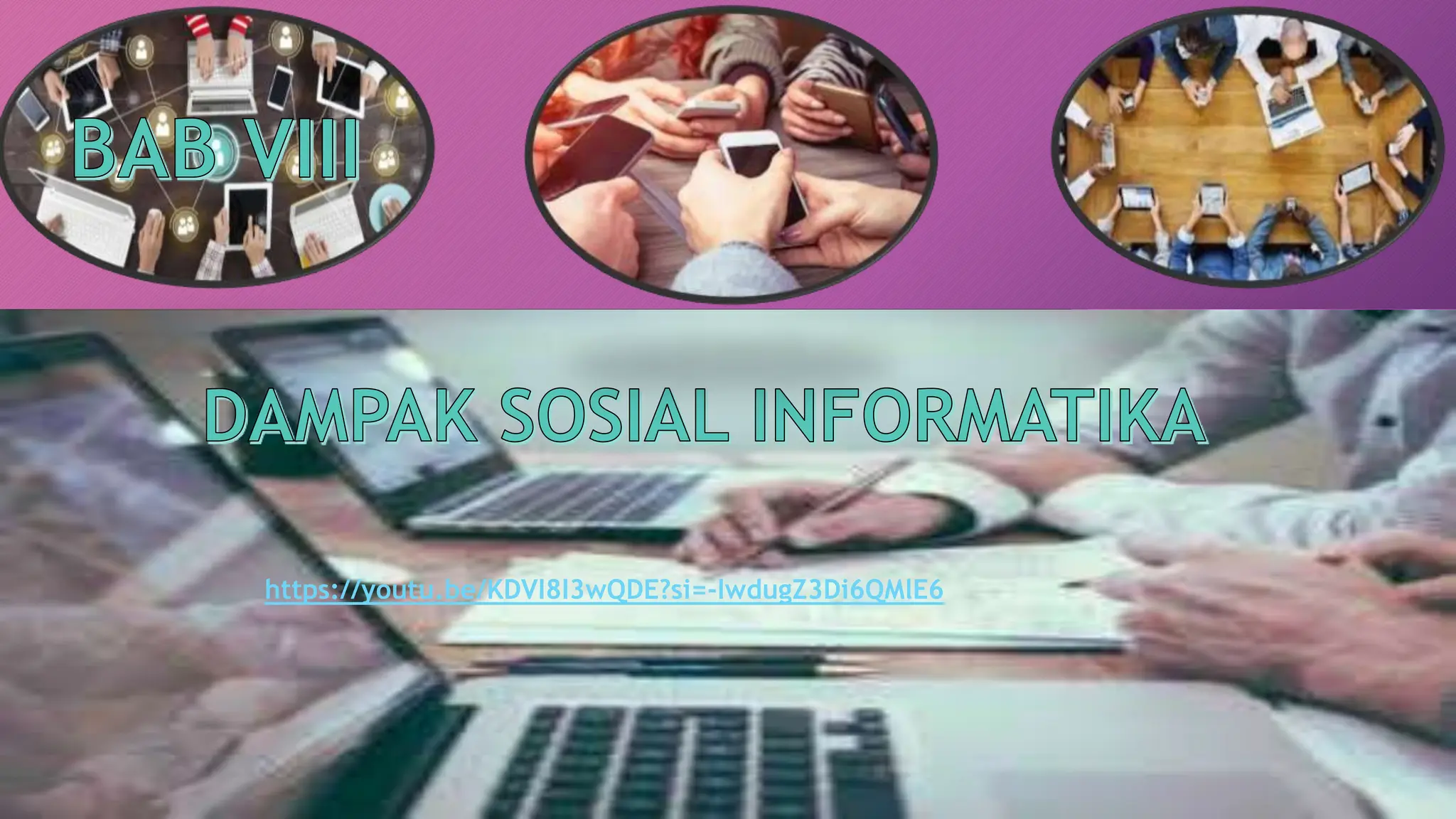 Perkembangan teknologi informasi dan komunikasi membawa dampak positif seperti kemudahan akses informasi dan komunikasi, serta peluang bisnis, tetapi juga dampak negatif seperti peningkatan cybercrime dan pengabaian interaksi sosial. Materi pembelajaran mencakup sejarah komputer, aspek ekonomi dan hukum informatika, serta studi lanjutan di bidang ini. Informatika sosial mempelajari hubungan antara teknologi informasi dan masyarakat, mencerminkan perubahan sosial yang diakibatkan oleh teknologi.