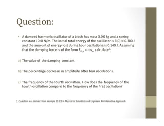 This document provides the solution to calculating properties of a damped harmonic oscillator. It is a 3 kg block attached to a spring with a 10 N/m constant. The initial energy is 0.300 J and 0.140 J is lost after 4 oscillations.
