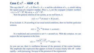 The document discusses damped vibrations of a spring-mass system. It notes that real systems experience damping due to friction, unlike the undamped model. There are three cases to consider based on the relationship between the damping coefficient c and spring constant k: A) heavily damped if c^2 - 4kM > 0, B) critically damped if c^2 - 4kM = 0, and C) underdamped if c^2 - 4kM < 0. For case A, the roots are distinct and real, leading to an exponential decay without oscillations. For case B, the roots are equal, resulting in decay attenuated by a linear factor.