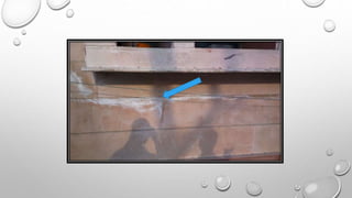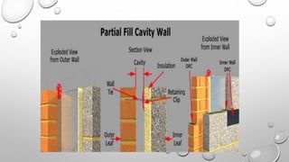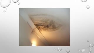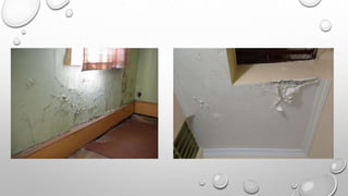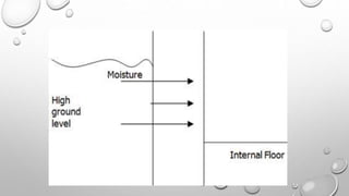 Dampness in buildings refers to the penetration of moisture through walls, floors, and roofs. There are several common causes of dampness, including rising damp from capillary action of water through porous materials, bridging of cavity walls that allows water penetration, and hygroscopic salts left behind as water evaporates that attract more moisture. Other causes are penetrating dampness through failures in building materials or coatings, and condensation that occurs when warm, moisture-laden air cools and deposits water on surfaces. Effective treatments include installing damp proof courses, surface treatments, integral waterproofing methods, and special devices.