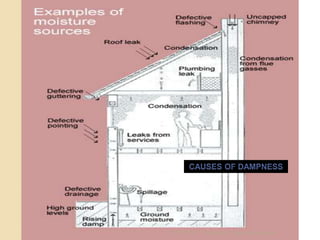 This document discusses various causes and types of dampness that can occur in buildings. It describes rising damp, which occurs when water rises up walls through capillary action from the soil. To prevent this, damp-proof courses (DPCs) made of impervious materials like slate or bitumen felt are installed. Deterioration or bridging of the DPC can lead to dampness. Hygroscopic salts in rising damp water can also cause issues by continuing to attract moisture after repairs. The document also discusses penetrating dampness from external water entering walls, condensation dampness caused by high humidity and ventilation issues, and bridging of cavity walls. Treatments include replacing or injecting new DPCs, drainage improvements,