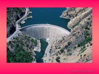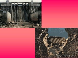 Dams are solid barriers constructed across rivers to store flowing water for uses like hydropower, irrigation, water supply, flood control, and navigation. The main types of dams are gravity dams, buttress dams, arch dams, and earth dams. Gravity dams are massive concrete structures where the weight forces are transmitted straight down. Buttress dams are reinforced gravity dams with structural supports. Arch dams are curved upstream to transmit water forces to the valley walls. Earth dams are broad, trapezoidal structures built of compacted earth and rock when foundations cannot support heavier dam types.