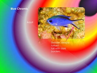 This document describes the characteristics of several species of damselfish at different life stages. It provides details about their coloration and markings as juveniles and adults. The damselfish species discussed include the Blue Chromis, Brown Chromis, Threespot Damselfish, Beaugregory, Bicolor Damselfish, Cocoa Damselfish, Dusky Damselfish, Longfin Damselfish, Yellowtail Damselfish, and Sergeant Major. Their identifying features such as color patterns on the tail, fins, body, and face are outlined for each life stage.