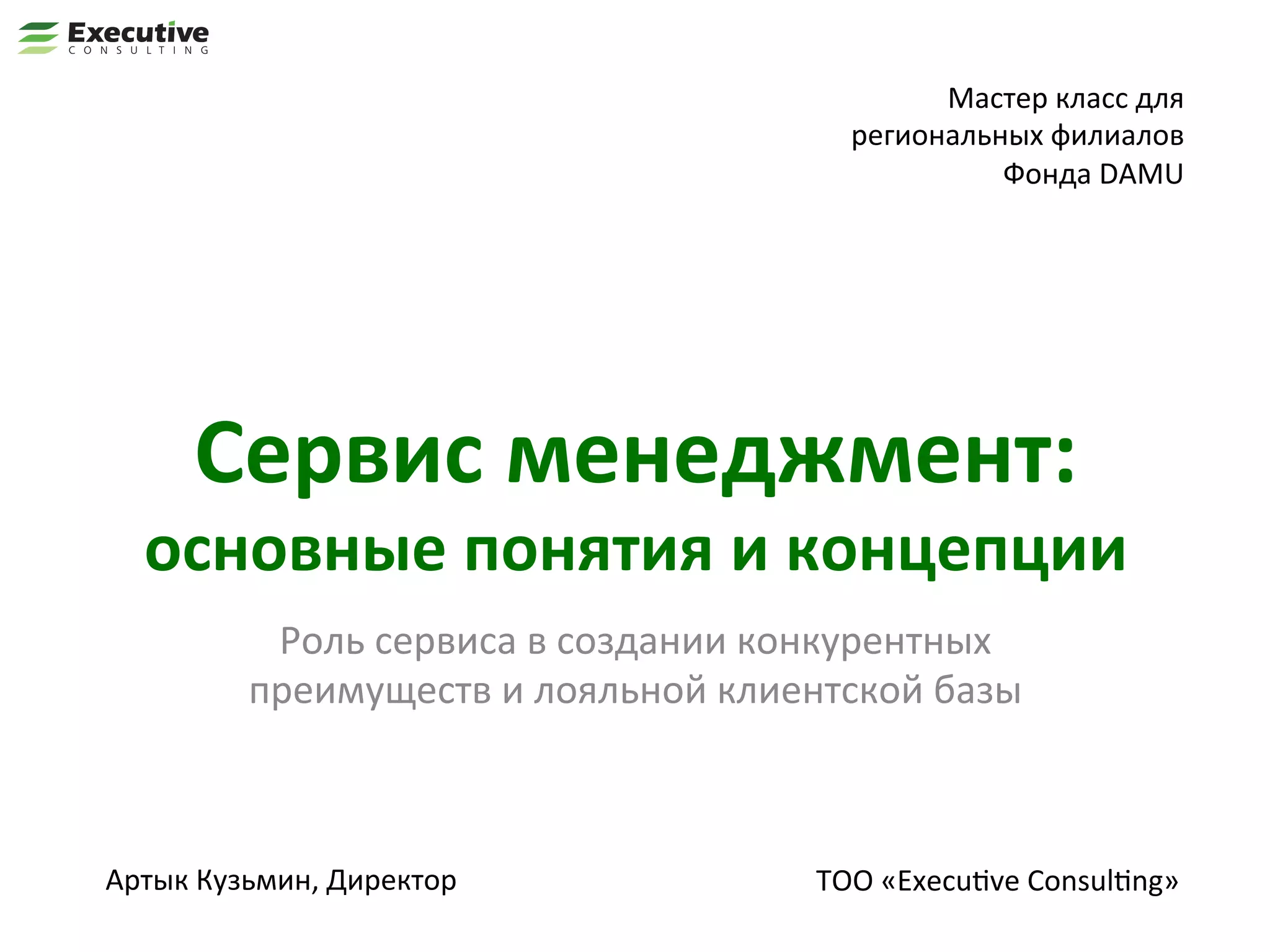 Документ представляет мастер-класс по сервис-менеджменту, акцентируя внимание на важности качественного обслуживания в государственных услугах для формирования доверия граждан. Обсуждаются методы повышения лояльности клиентов и значимость клиентского опыта в конкурентной среде. Также подчеркивается, что высокое качество сервиса является не только инвестициями, но и стратегическим преимуществом для компаний.
