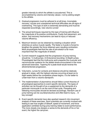 This document provides guidelines for implementing plyometric training, which involves fast eccentric-concentric muscle contractions to improve neuromuscular responses. It recommends a gradual progression from multi-jumps to depth jumps. Volume and recovery guidelines are provided for different phases and exercises. A plyometric inventory is also included, outlining specific exercises such as multi-jump circuits, endurance bounding, depth jumps, and jump-throw combinations. Proper technique and programming are emphasized to maximize benefits while avoiding injury risks from overtraining.