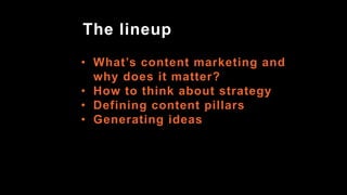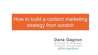 This document provides guidance on building a content marketing strategy from scratch. It begins by establishing why content marketing is important, noting statistics on its effectiveness and cost savings compared to traditional marketing. It then discusses starting with a strategy by defining goals, budgets, responsibilities and logistics. Key aspects of a strategy include understanding the audience, defining content pillars around which to build the strategy, and generating ideas from sources like keywords, customer feedback and seasonal trends. The document stresses the importance of quality over quantity in content.
