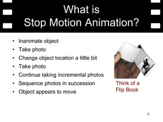 The document outlines a workshop on creating stop motion animation using iMovie, aimed at 5th and 6th graders. It details the skills developed through this activity, such as sequencing and teamwork, and provides a step-by-step process for students to create their own animations. Additionally, it includes classroom applications across subjects like math, science, and social studies.