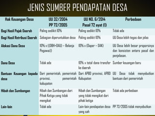 Dokumen ini membahas pengelolaan dan alokasi dana desa sesuai dengan peraturan yang berlaku, termasuk sumber-sumber pendanaan dan penggunaan dana tersebut untuk pembangunan dan pemberdayaan masyarakat. Juga diuraikan risiko, tantangan serta sanksi administratif bagi desa yang tidak mengelola dana dengan baik. Penggunaan dana desa harus diarahkan untuk meningkatkan kesejahteraan masyarakat dan memperbaiki infrastruktur desa.