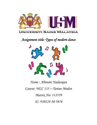 This document provides an overview of different styles and types of modern dance. It discusses the origins of modern dance in the early 20th century as a new movement that emphasized personal expression in contrast to ballet. Some pioneers who developed unique styles are named, such as Isadora Duncan, Ruth St. Denis, and Martha Graham. The document then summarizes several specific modern dance styles and types, including tango, castle walk, mambo, hip hop, jazz, contemporary dance, and cha cha cha.