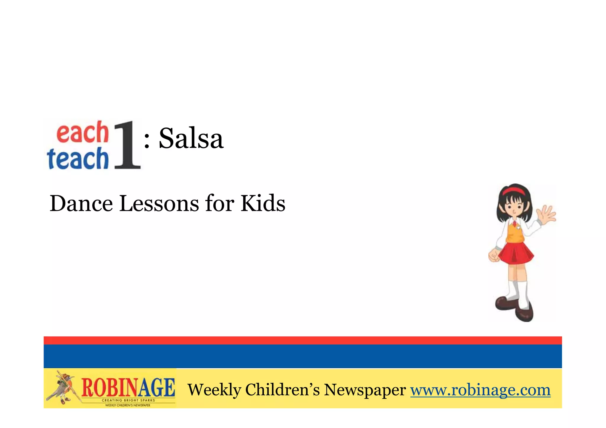 The document teaches the basic steps of salsa dancing for kids. It explains that salsa is a social dance from South America typically done at ballroom competitions. The summary outlines the 11 steps taught, which include how the boy and girl should hold each other, taking turns moving forward and backward, and how to do a simple spin move called a "spot turn." The goal is for the students to learn the fundamental Cuban salsa dance positions and footwork.
