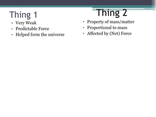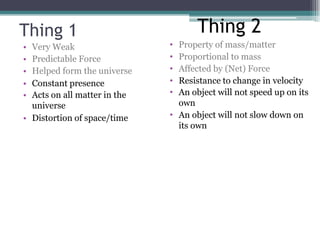 The document describes the fundamental force of gravity. It explains that gravity is a weak but predictable force that helped form the universe and has a constant presence, distorting space and time and acting on all matter through mass. Gravity keeps objects like ourselves on Earth and the Earth orbiting the sun according to laws proposed by Newton and Einstein describing gravity's proportional relationship to mass and dependence on net force and inertia.