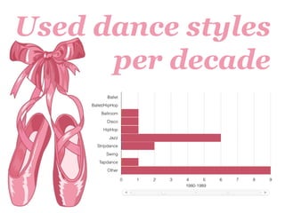 Il documento analizza gli stili di danza utilizzati nel corso delle diverse decadi. Ogni decennio presenta tendenze e influenze uniche nel panorama della danza. L'argomento evidenzia l'evoluzione e la crescente diversità degli stili nel tempo.