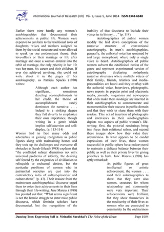 This document provides an abstract and summary of Mrinalini Sarabhai's autobiography "The Voice of the Heart". It discusses how Sarabhai constructed her identity as a renowned dancer and public figure while also fulfilling domestic roles as a daughter, wife and mother. It explores how she overcame obstacles to pursue her passion for dance and established herself internationally. Key events discussed include her breakthrough performance in Paris which earned her fame and success in the Western world.