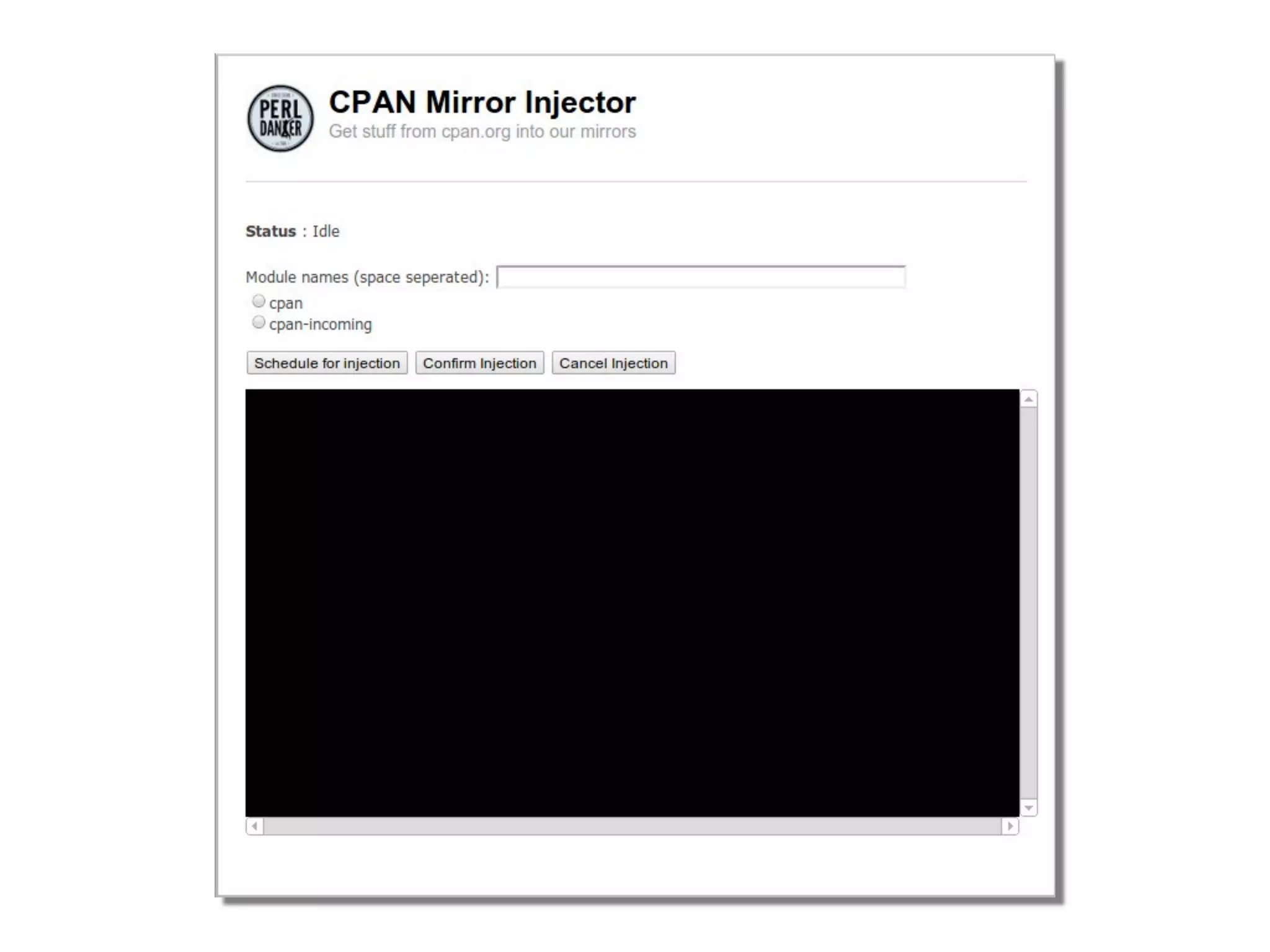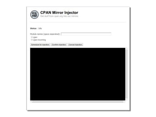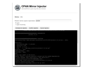 The document discusses a web application built using Dancer and WebSockets for a Perl product at a company. It highlights the setup process for a local CPAN mirror and the functionality of a web injector that allows users to manage module injections through a simple web interface. The system uses real-time updates via WebSockets to provide status and logs to users without the need for sessions or databases.