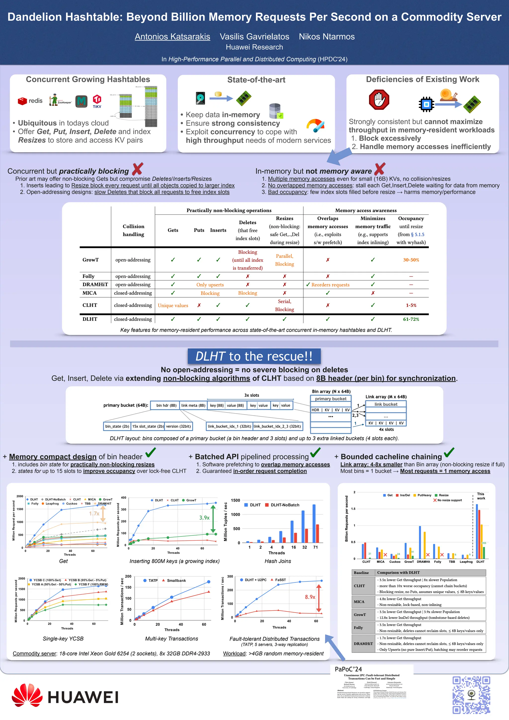The document discusses the limitations of existing high-performance concurrent hashtables in handling memory accesses, particularly for in-memory workloads, and introduces the Dandelion Hashtable (DLHT) as an innovative solution. DLHT improves upon traditional designs by offering non-blocking operations, optimized memory access patterns, and efficient resizing mechanisms, achieving over a billion memory requests per second on a commodity server. Key features include a compact design, memory prefetching, and improved occupancy rates, demonstrating notable performance boosts over existing concurrent hashtables.