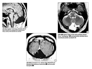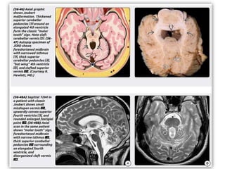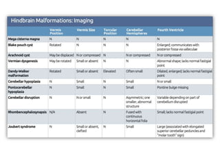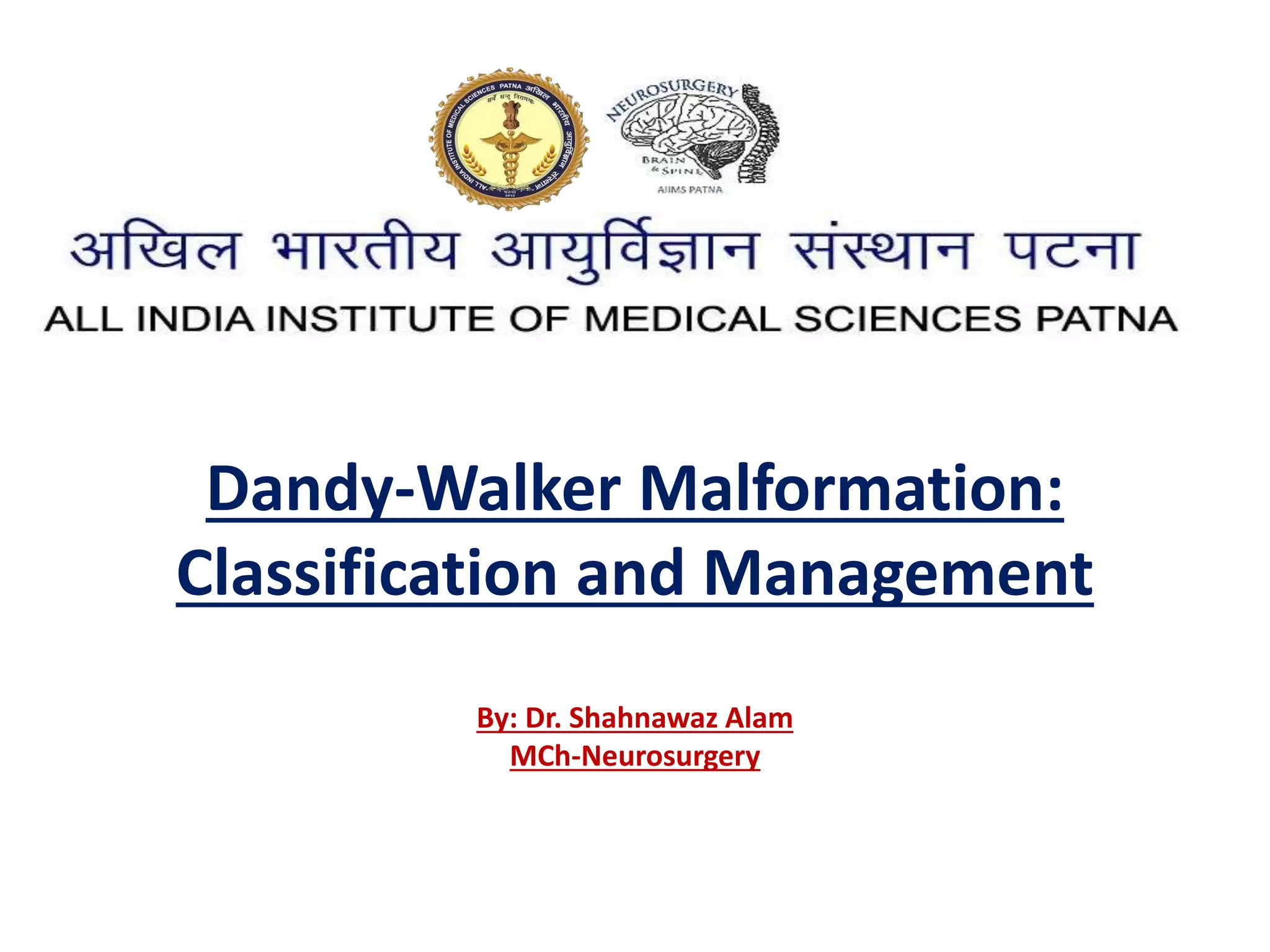Dandy-Walker malformation is a congenital brain abnormality where the cerebellum and fourth ventricle are abnormally developed. It ranges in severity from mild vermian hypoplasia to more severe presentations with cyst formation. Treatment involves managing hydrocephalus with ventriculoperitoneal shunting, though some mild cases require no treatment. Complications can include herniation of brain structures if only certain areas are shunted, so simultaneous dual shunting of the lateral ventricles and fourth ventricle cyst may be preferable. Long term outcomes depend on severity but can include normal intelligence if the malformation is mild without other brain anomalies.