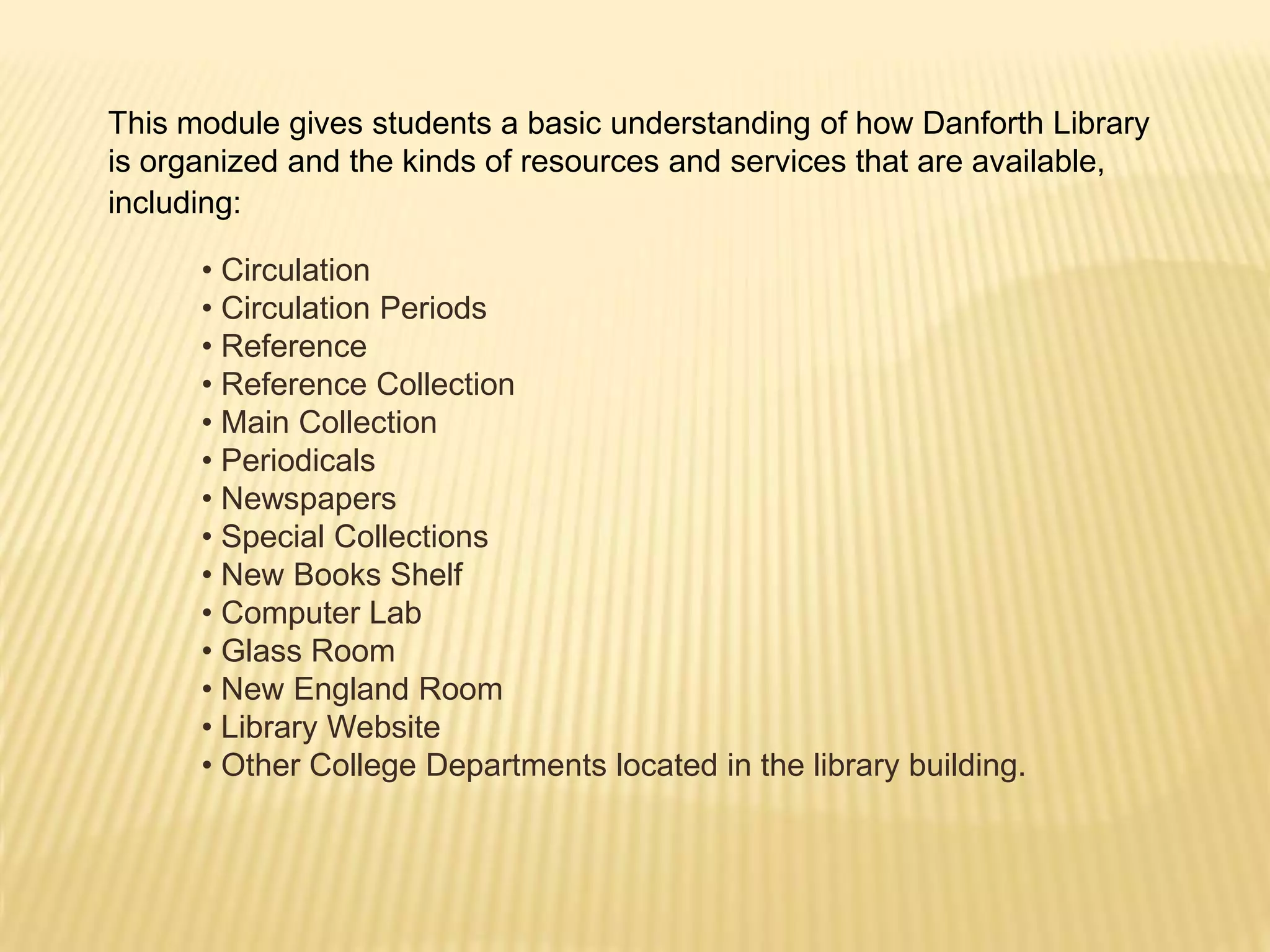 The H. Raymond Danforth Library at New England College provides various resources and services including circulation, reference, periodicals, special collections, and a computer lab. It is organized into departments like circulation, reference, and periodicals. Students can borrow books, get research help, access newspapers and journals, and use materials from special collections that require in-library use. Other campus departments like tutoring and IT are also located in the library building.