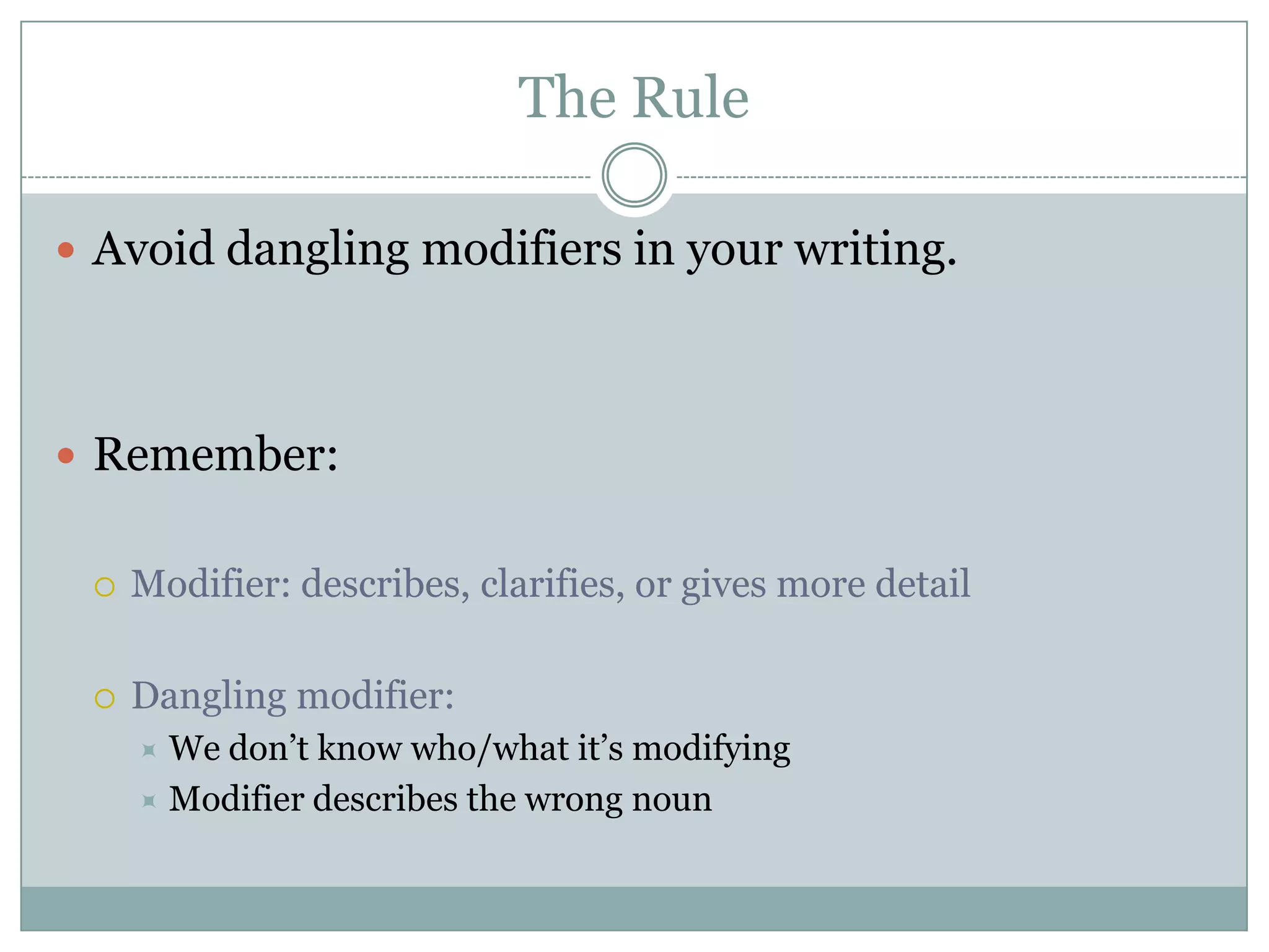 The document discusses dangling modifiers and how to avoid them. It defines a dangling modifier as one that does not clearly modify a specific noun. Examples are given of dangling modifiers and how to fix them by specifying the noun being modified. The importance of avoiding dangling modifiers in writing is emphasized.