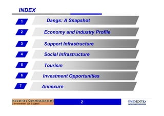 The document provides an overview of the Dangs district of Gujarat, India. It summarizes that Dangs has a population of around 186,712 people scattered across several towns. The main economic activities are agriculture, animal husbandry, bamboo cutting, and around 100 small-scale industries. Tourism is also emerging as an important sector for the district with places like Saputara hill station and wildlife sanctuaries attracting visitors. The document outlines various infrastructure like roads, education, healthcare and water supply available in Dangs and identifies opportunities for investment in sectors like agriculture, dairy, tourism and food processing.