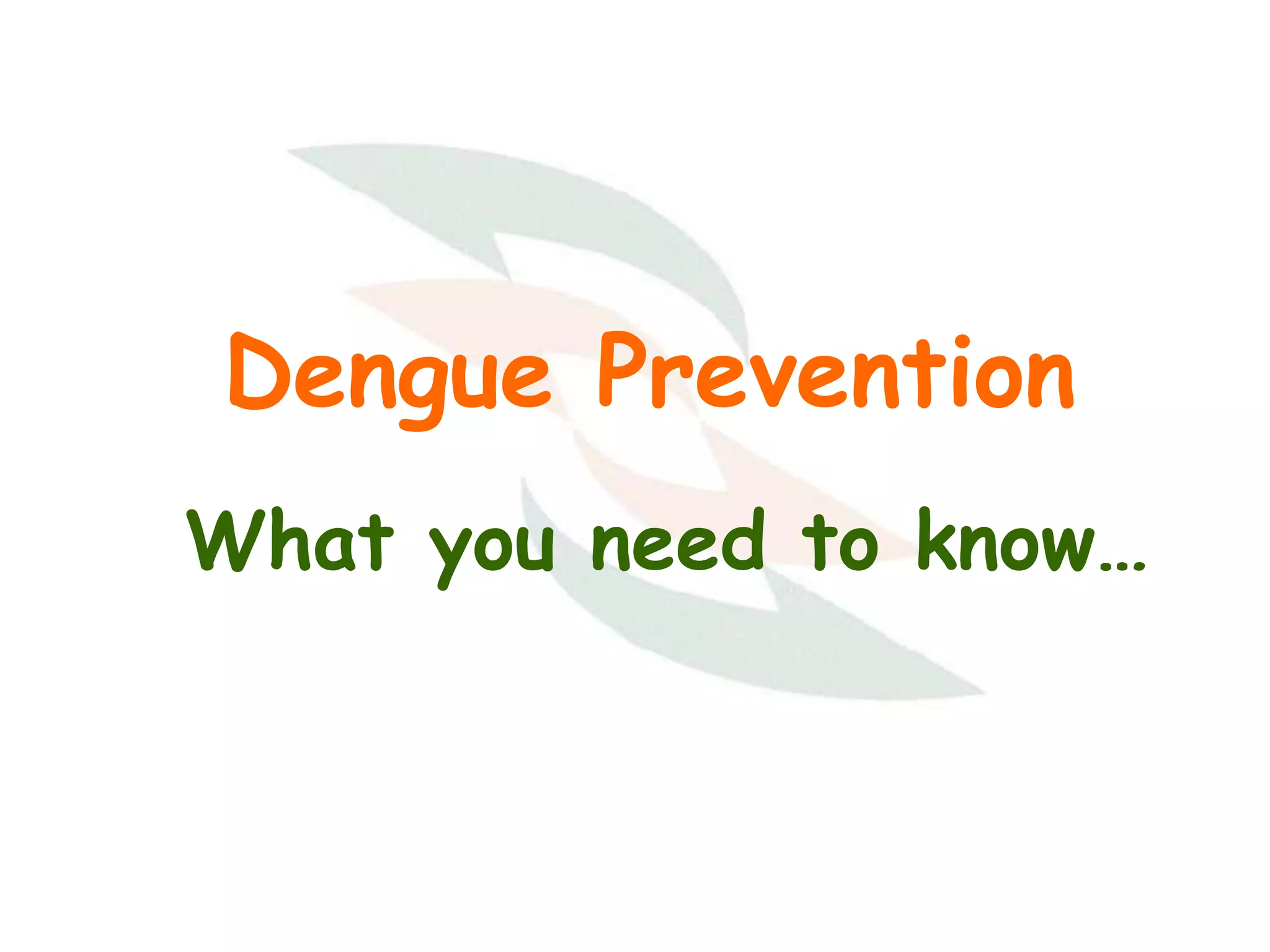This document provides information about dengue prevention. It describes dengue fever as an illness caused by the dengue virus and transmitted by the Aedes mosquito. It outlines the symptoms of dengue fever and characteristics of the Aedes mosquito, such as its black and white stripes and daytime biting. The document details the Aedes mosquito's life cycle and how it transmits diseases from infected to healthy individuals through biting. It recommends preventing dengue by eliminating all sources of stagnant water where Aedes lay eggs and conducting regular 10-minute inspections to remove any containers holding water.
