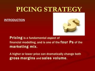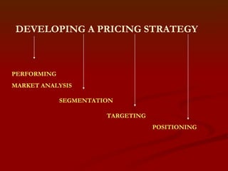 Pricing is a fundamental aspect of financial modeling and is one of the four Ps of the marketing mix. Developing an effective pricing strategy involves performing market analysis to understand customer segments, targeting specific segments, and positioning your offering accordingly. Market analysis identifies actual and potential customers, segmentation divides the market into prevailing groups like gender and age, and targeting focuses marketing and packages on attracting specific segment groups.