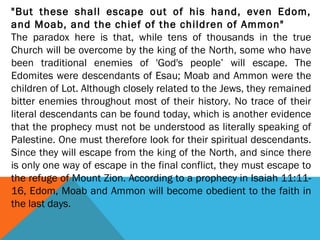 This document provides commentary on Daniel 11:1-15, which outlines the history between the Persian Empire and the people of God, and then the Grecian Empire and the people of God. It summarizes the succession of kings in the Persian Empire after Cyrus, and the divisions that arose after Alexander the Great's death. The main focus is on the series of conflicts known as the Syrian Wars between the Ptolemaic dynasty in Egypt (king of the south) and the Seleucid dynasty in Syria (king of the north), as they vied for power over Palestine where God's people lived.