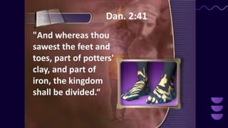 King Nebuchadnezzar has a dream that troubles him, but he cannot remember the dream. He demands that his magicians and wise men tell him both the dream and its interpretation. When they are unable to do so, he decrees that they should all be killed. Daniel is able to interpret the king's dream, saving the lives of the wise men. The king's dream foretells four successive world empires, and Daniel explains that the dream reveals that God controls the rise and fall of nations. The king is greatly impressed by Daniel's wisdom and ability, and appoints him to a high position in Babylon.