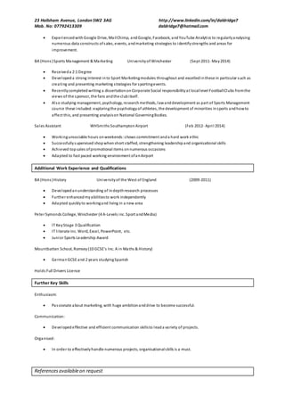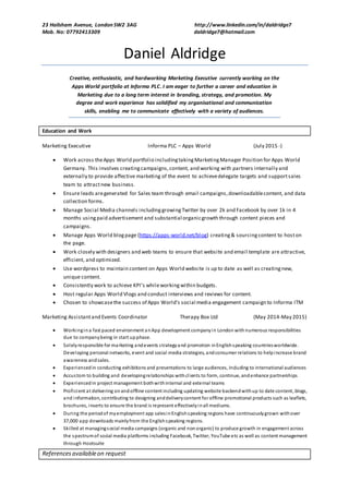Daniel Aldridge is a creative and hardworking Marketing Executive currently working for Informa PLC on their Apps World portfolio. He has over two years of experience in marketing roles, generating leads and growing social media followers. Aldridge holds a BA in Sports Management and Marketing and is eager to advance his career in marketing through solid communication, organizational, and project management skills developed through work and education.