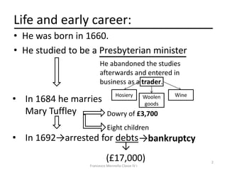 Daniel Defoe was born in 1660 in England. He studied to be a Presbyterian minister but later abandoned his studies to enter business, including hosiery, woolen goods, and wine. In 1684 he married and had eight children. In 1692 he was arrested for debts and declared bankruptcy. Defoe then became a prolific writer, publishing pamphlets, journals, and novels. As the father of the English novel, he pioneered first-person narration and the portrayal of realistic characters and misfortunes. In his later years, he wrote conduct manuals and guides before dying in poverty in 1731.