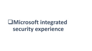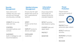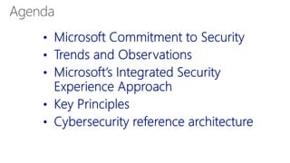 The document discusses Microsoft's approach to security and how the threat landscape is evolving. It emphasizes building an integrated security experience that combines data from across Microsoft products and services with machine learning to better detect and respond to threats. It also outlines Microsoft's strategy to make attacks more costly for threat actors by disrupting their economic models and technical playbooks through rapid response capabilities and a defense in depth approach across identity, devices, infrastructure and applications.