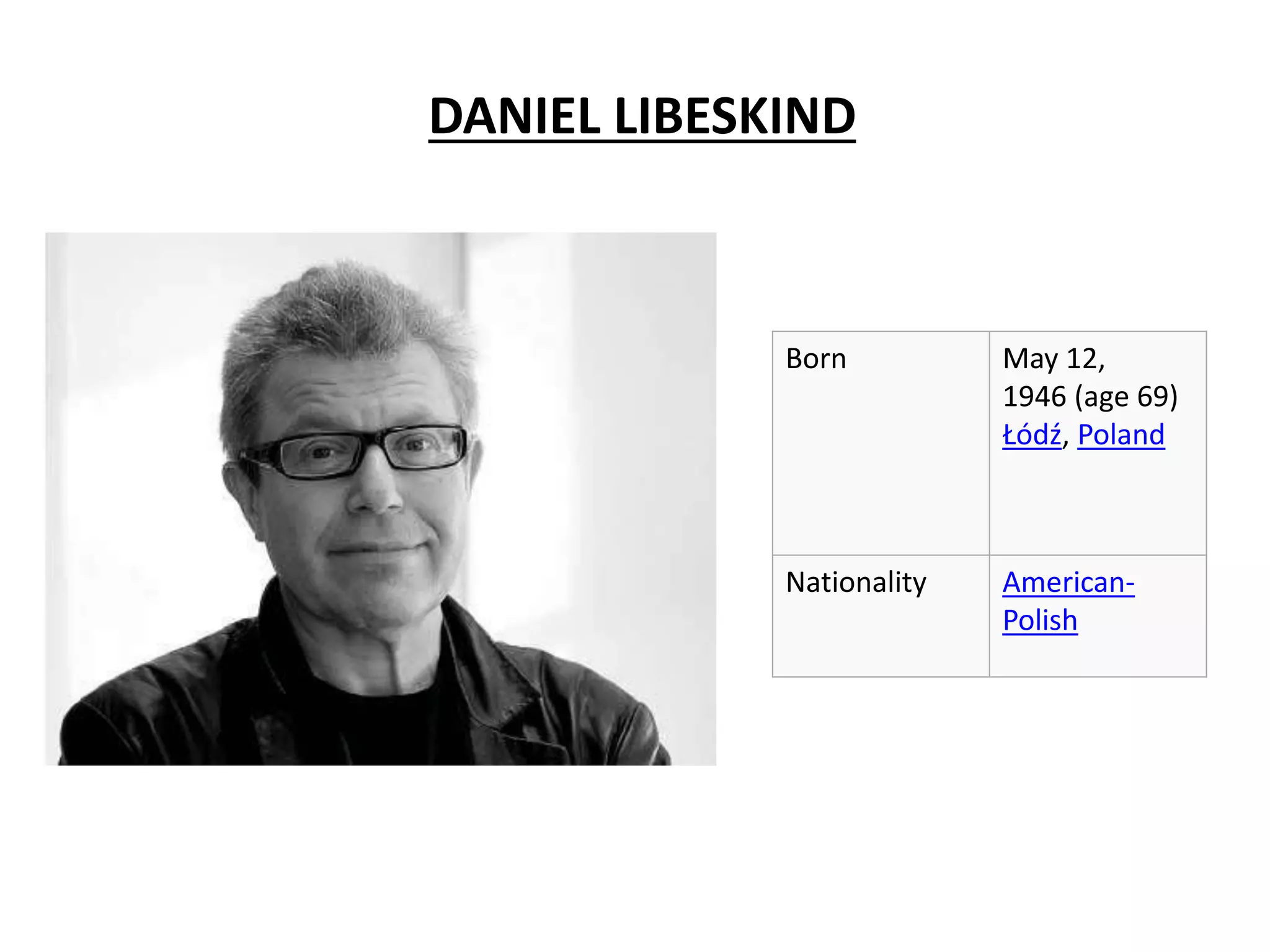 Daniel Libeskind is a Polish-American architect known for his unique and culturally evocative designs, including the Jewish Museum in Berlin and the Imperial War Museum in Manchester. His work often features dramatic angles, strong geometries, and a reflection of historical significance. Libeskind's designs blend modern architecture with his Polish background, aiming to create spaces that evoke memory and provide a unique architectural experience.