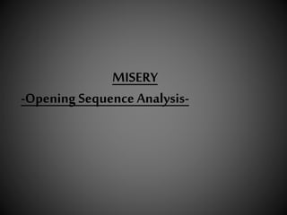 The opening sequence introduces the main character Paul Sheldon, a writer. Through a series of close-up shots, the viewer learns that Paul has just finished writing his story, as evidenced by him typing "THE END." Paul is seen celebrating alone with champagne and a cigarette, indicating he leads a lonely lifestyle focused on his writing. The sinister music and title "Misery" foreshadow that completing his work will lead Paul to misery. This opening sequence builds intrigue around Paul's identity and work while eliciting sympathy from the viewer for his solitary existence.