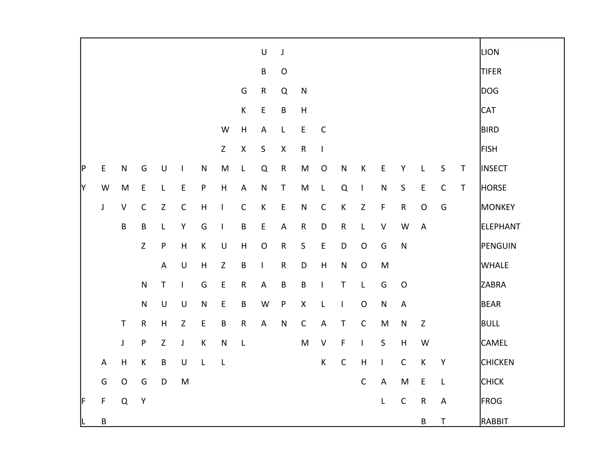 The document contains a matrix of letters that spells out different animal names arranged in a grid. It includes common animals such as lion, tiger, dog, cat, bird, fish, monkey, elephant, horse, and more.