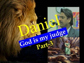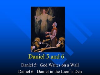 Daniel 5 describes a scene where God writes a mysterious message on a wall during Belshazzar's feast that only Daniel can interpret, warning of Babylon's imminent fall. Daniel 6 tells of Daniel being thrown into a lion's den after continuing to pray, but being protected by God, while his accusers are devoured. The document then analyzes Daniel's prophetic visions in chapter 7, identifying the four beasts as Babylon, Medo-Persia, Greece and Rome, and the "little horn" as a future power that will emerge. It discusses the judgment scene where God will rule definitively and give authority to his saints.