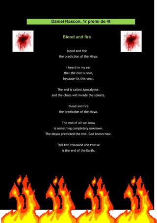 The poem discusses the Mayan prediction of the end of the world in 2012 through blood and fire. It refers to their prophecy of an apocalypse bringing chaos to the streets, with the end of all that is known being something completely unknown, as predicted by the Mayans, though God alone knows how. The poem emphasizes that 2012 marks the end of the Earth according to this prophecy.