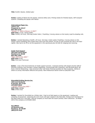 Daniel Fisher is seeking a new position and provides his resume. He has over 20 years of experience in warehousing, shipping/receiving, forklift operation, and heavy equipment operation. His most recent role was as Lead LTO/Warehouse Shipping and Receiving Clerk at Shaw Hardwood Flooring since 2014. He prides himself on being hardworking, honest, open-minded, flexible, and disciplined.