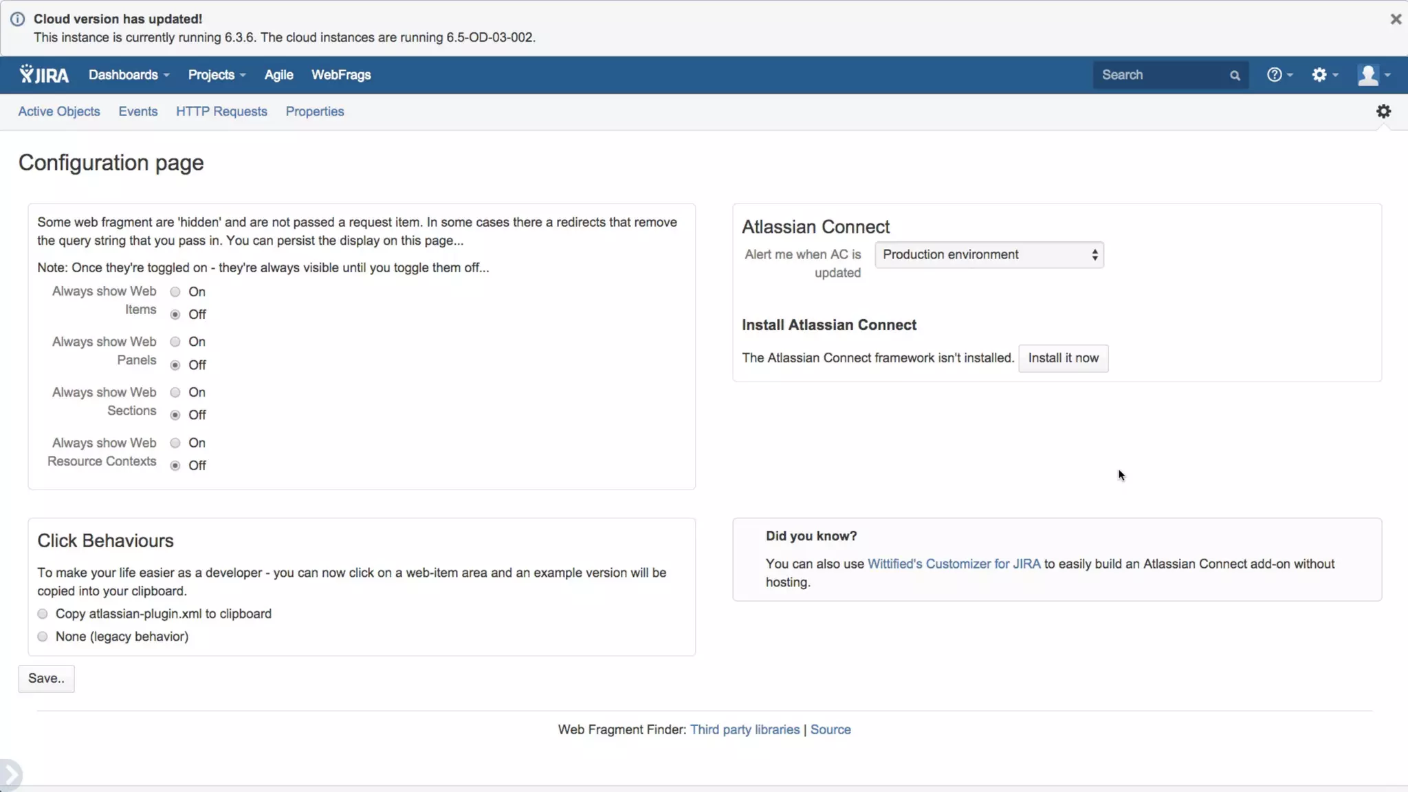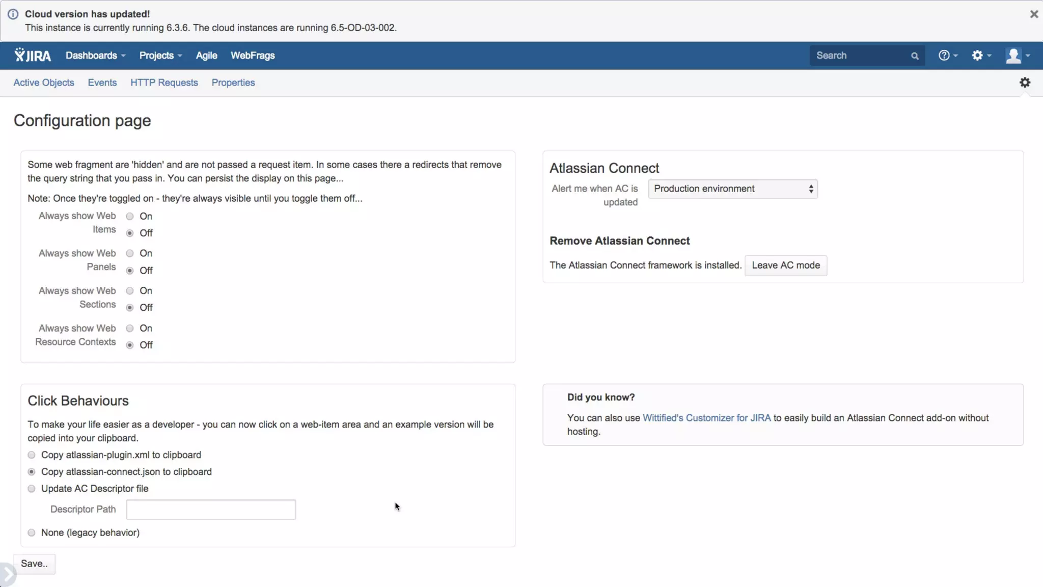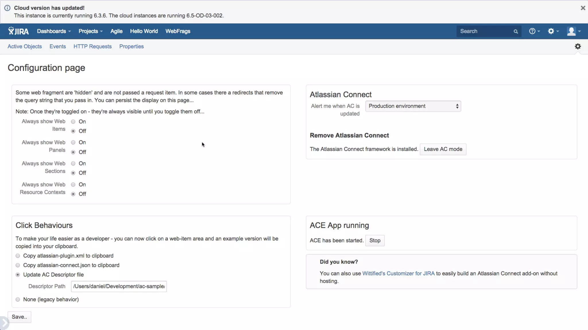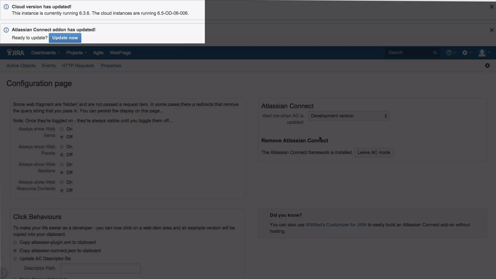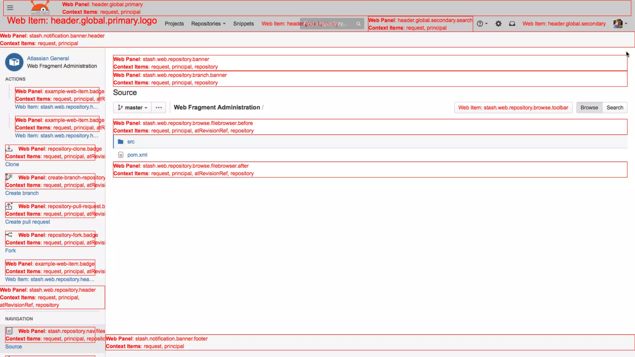 The document outlines the development of an Atlassian plugin, detailing the integration of active objects, event listeners, and web resources for dashboard tracking. It covers the structure of the plugin's XML descriptor, code for tracking dashboard views, and example web item configurations. Additionally, it provides guidance on managing Atlassian Connect addons and how to set up a development environment for these integrations.