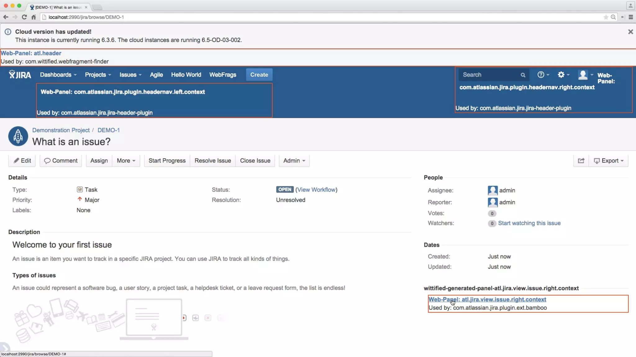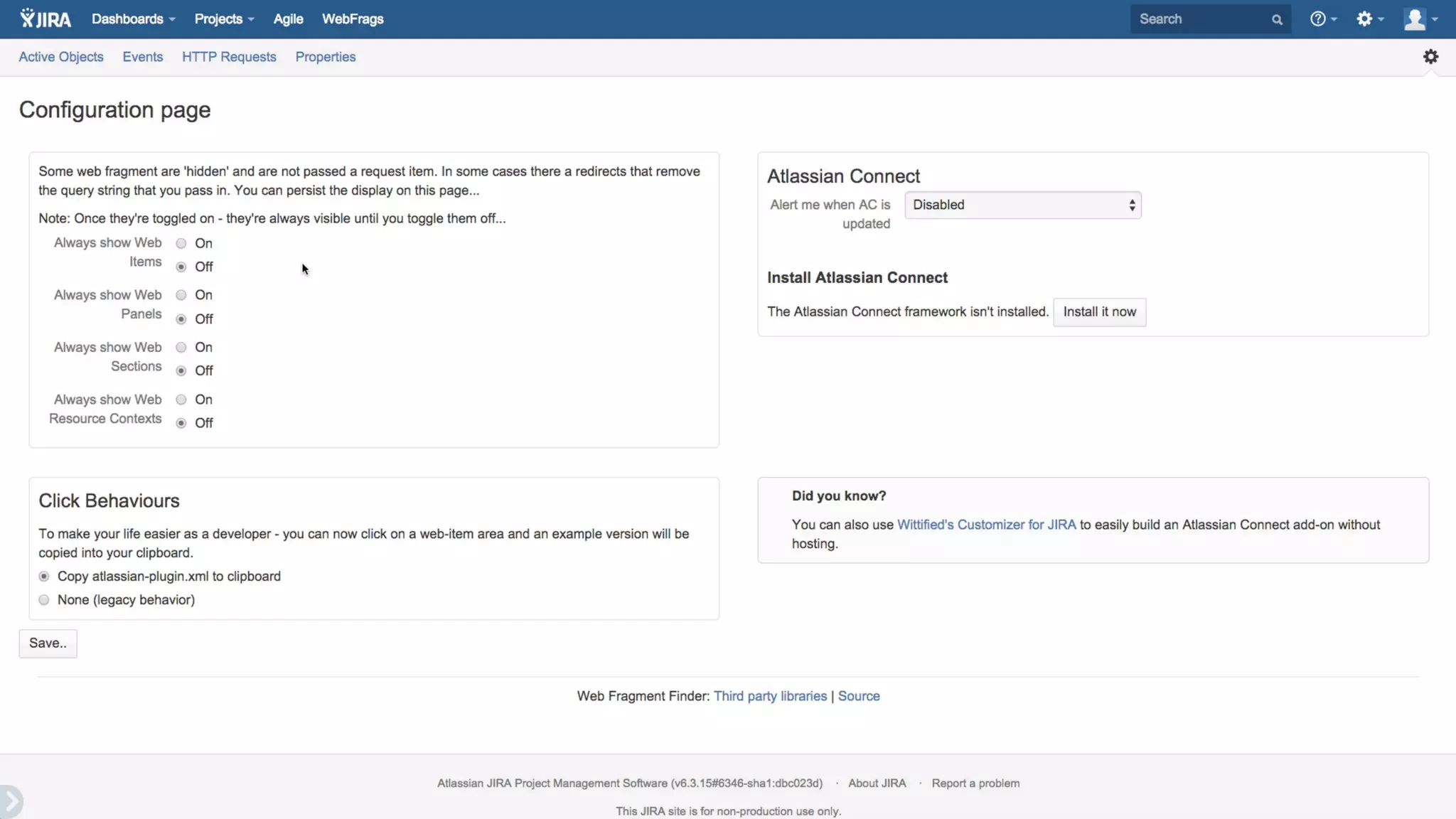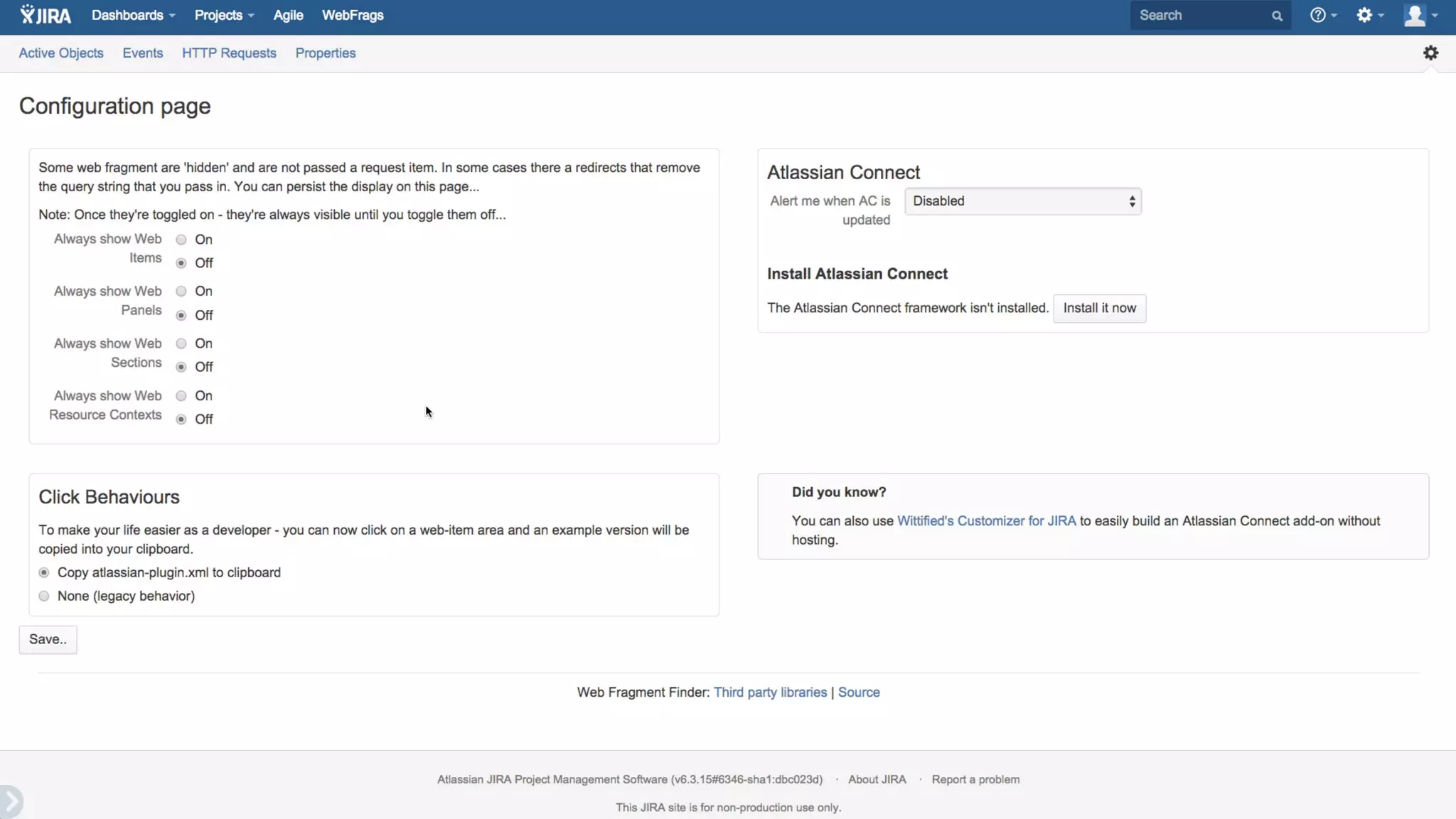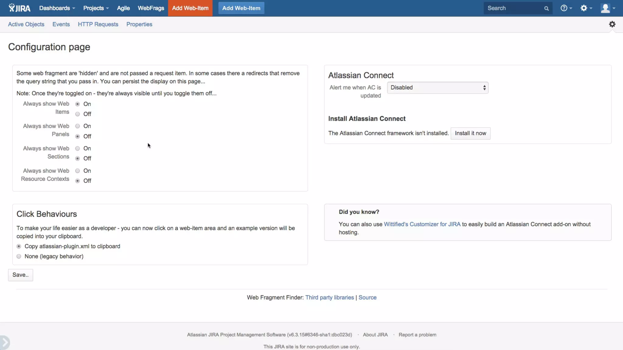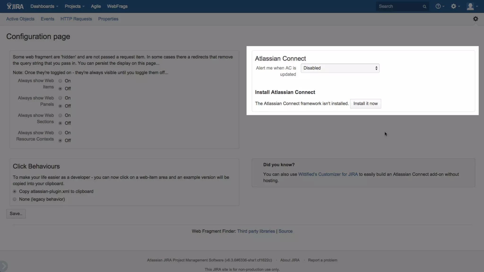 The document outlines the development of an Atlassian plugin, detailing the integration of active objects, event listeners, and web resources for dashboard tracking. It covers the structure of the plugin's XML descriptor, code for tracking dashboard views, and example web item configurations. Additionally, it provides guidance on managing Atlassian Connect addons and how to set up a development environment for these integrations.