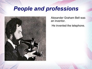 This document provides biographical information on Alexander Graham Bell, Frida Kahlo, and their professions. It notes that Alexander Graham Bell was a Scottish inventor born in 1847 who invented the telephone and died in 1922 in Nova Scotia, Canada. It also mentions that Mexican painter Frida Kahlo was born in 1907 and known for her colorful self-portraits, dying in 1954 in Mexico. The document was created by Daniela Neira Sánchez and Alba Peixoto Castro.
