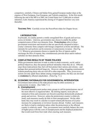 This document provides an outline for Chapter 7 of a textbook on international trade. The chapter discusses how governments influence trade through various policies and instruments. It begins with an opening case study on textile trade restrictions between the US, Europe and other countries. The chapter then outlines the economic and noneconomic rationales governments use to intervene in trade, including protecting domestic industries and managing balance of payments. Finally, it examines the major instruments governments use to restrict or regulate trade, such as tariffs, subsidies, quotas and other nontariff barriers that directly or indirectly influence prices and quantities traded.