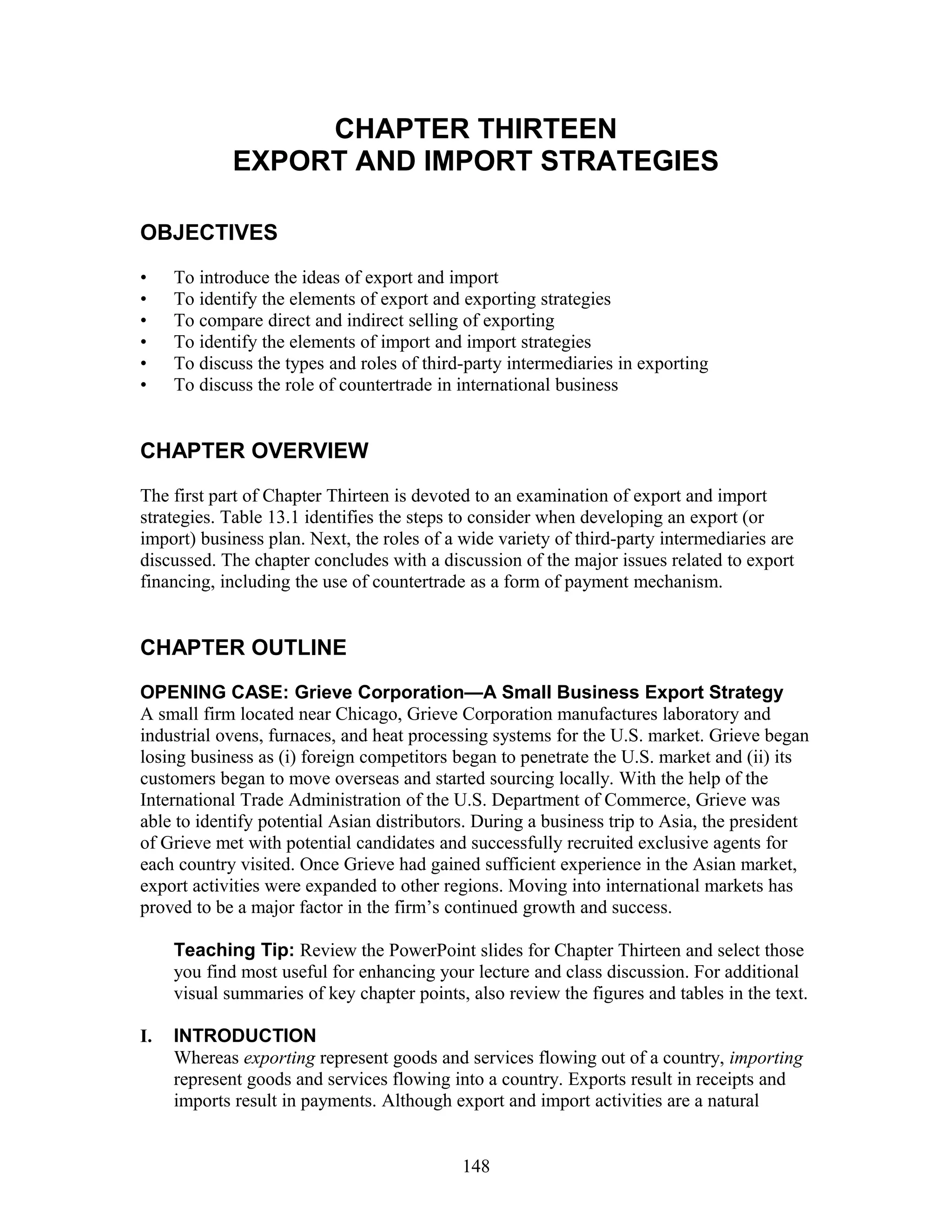 This document provides an outline for a chapter on export and import strategies. The chapter introduces concepts of exporting and importing, identifies elements of export and import strategies, and discusses third-party intermediaries involved in international trade. It covers the stages of export development, advantages and pitfalls of exporting, designing an export strategy, import strategy considerations, and types of countertrade agreements. The chapter aims to examine export and import strategies and roles of intermediaries in facilitating international business transactions.